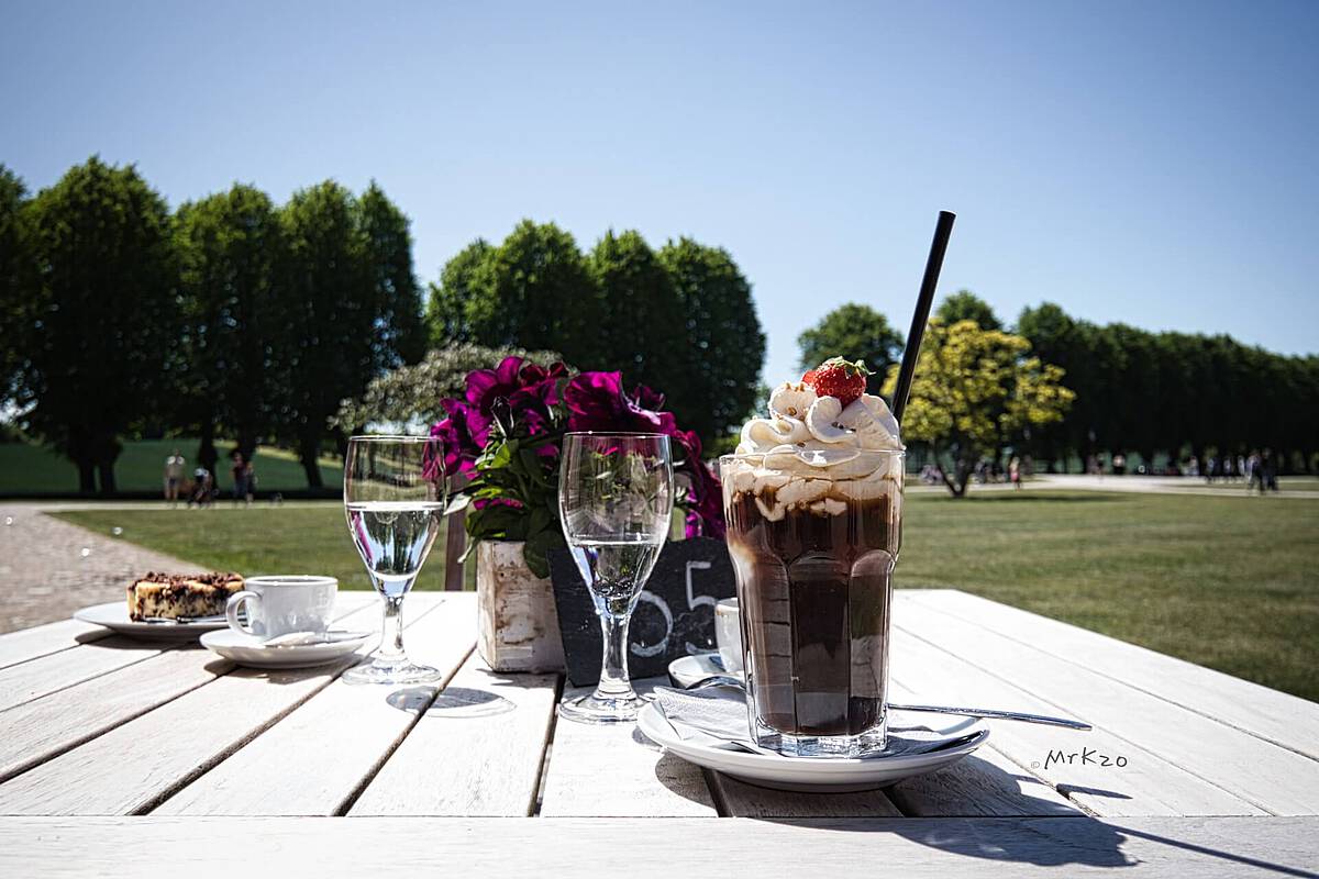 Bei schönem Wetter lädt die Terrasse direkt vor der Orangerie zum Verweilen ein. Der Duft von Kaffee, der Blick über die Allee der Bäume und das sanfte Rascheln der Blätter machen den Besuch zu einem echten Genussmoment.