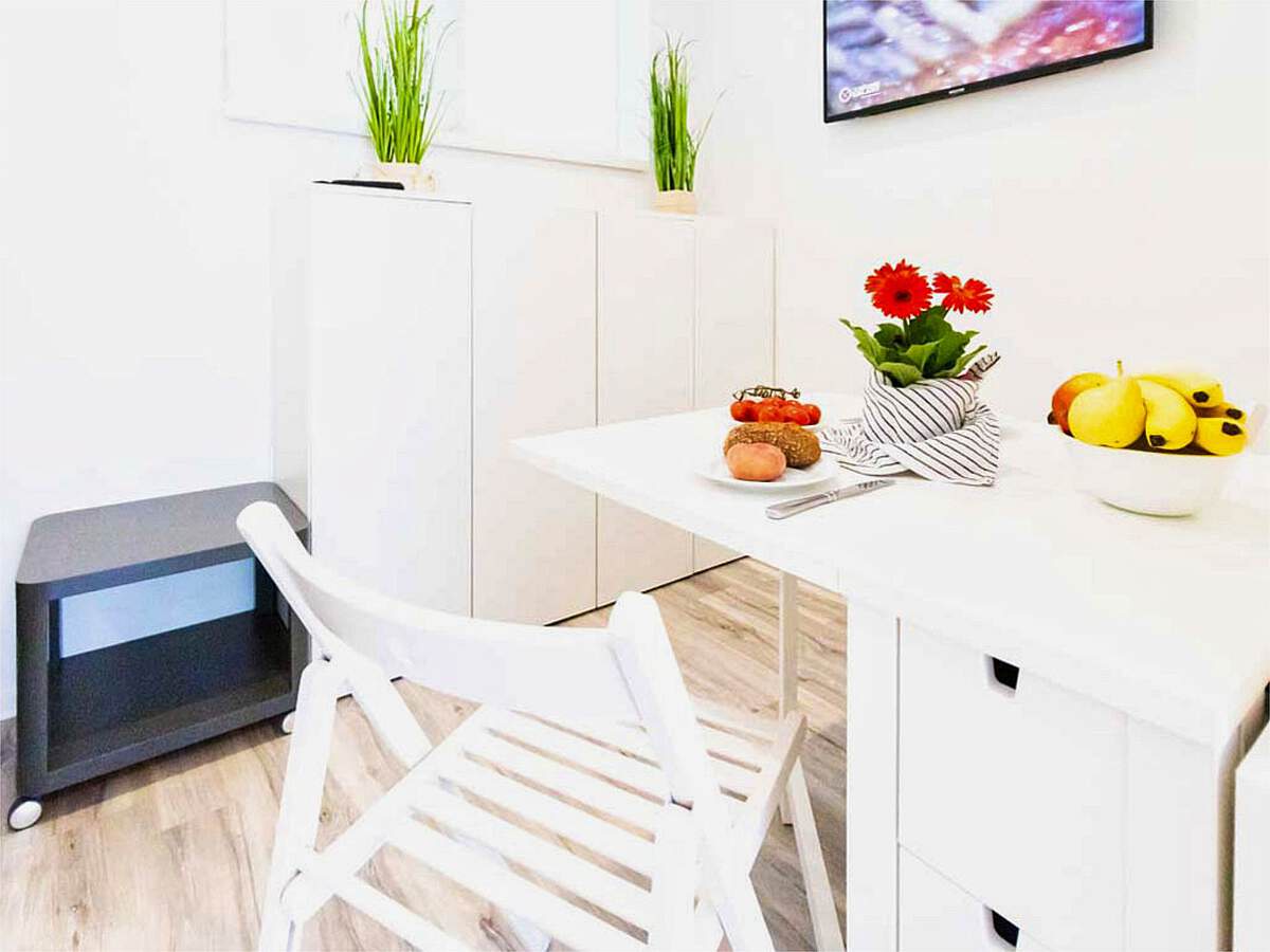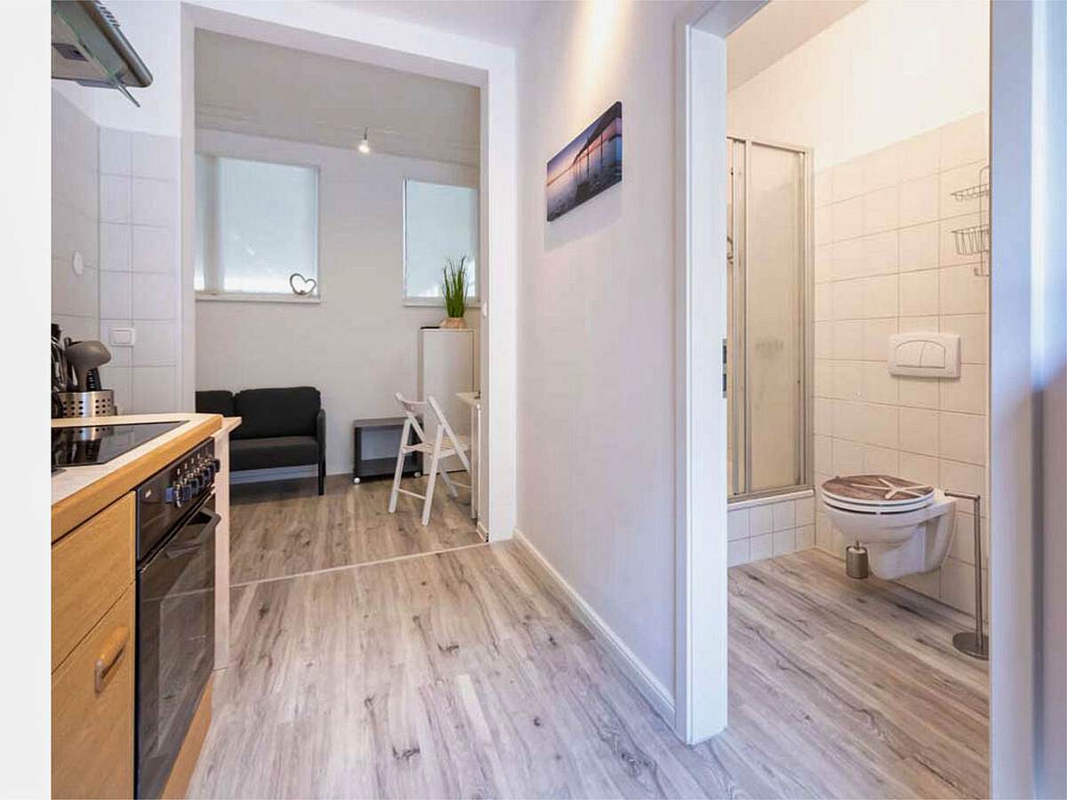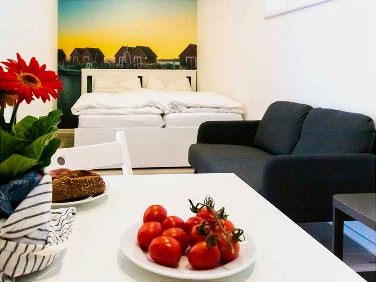 Der kombinierte Wohn- und Schlafbereich ist clever aufgeteilt und bietet mit einem 160 cm breiten Doppelbett hohen Schlafkomfort nach einem Tag am Meer. Die praktische Küchenzeile ist voll ausgestattet: Mit Ceranfeld, Backofen und Kühlschrank finden Sie alles Nötige für die Zubereitung Ihrer Urlaubsmahlzeiten vor. Ein helles Badezimmer mit Dusche sorgt für einen frischen Start in den Tag.