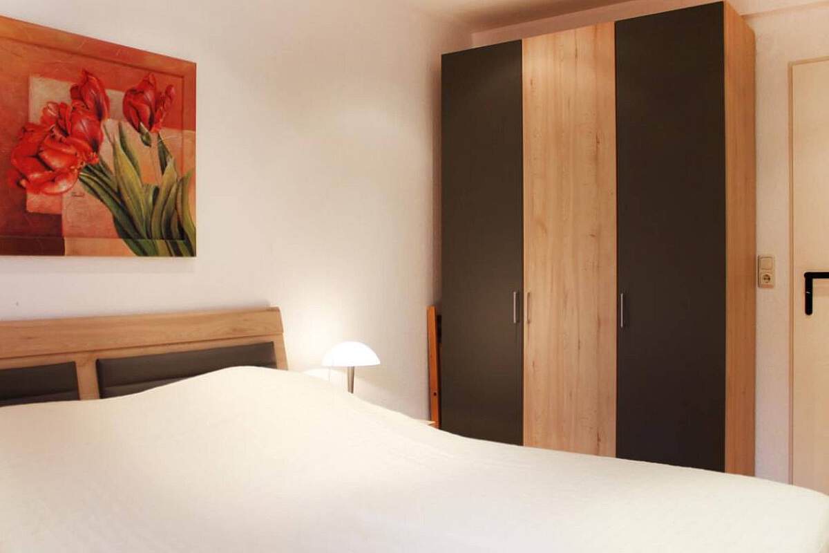 Das erste Schlafzimmer ist mit einem komfortablen Doppelbett und Kleiderschrank ausgestattet; für die kleinsten Gäste stehen hier ein Kinderbett aus Holz und ein Hochstuhl bereit. Das zweite Schlafzimmer verfügt ebenfalls über ein Doppelbett, einen eigenen Flachbild-TV und Stauraum für Ihre Garderobe. Ein praktischer Abstellraum rundet das Angebot ab.