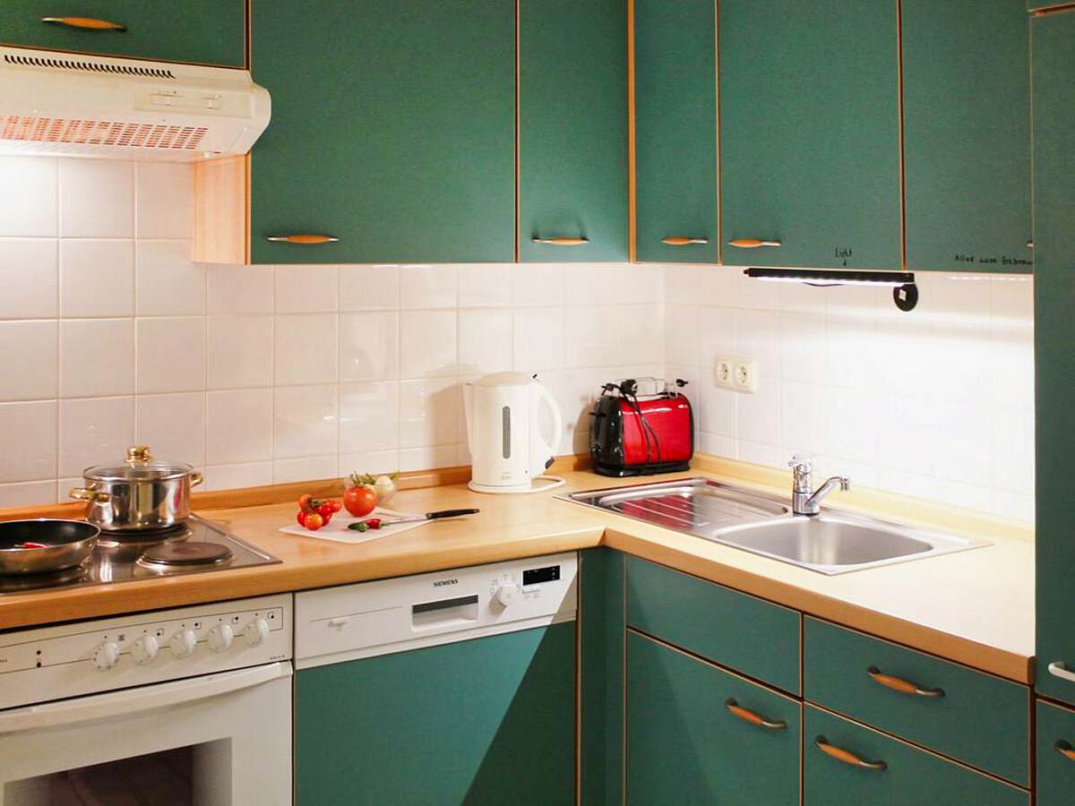 Der helle Wohn- und Essbereich ist mit einem großen Esstisch für 6 Personen, einem Fernseher (SAT, DVD, Video) und einem CD-Recorder ausgestattet – ideal für gemeinsame Spieleabende. Die separate Küchenzeile ist mit Herd, Backofen, Geschirrspüler und Kaffeemaschine voll bestückt.