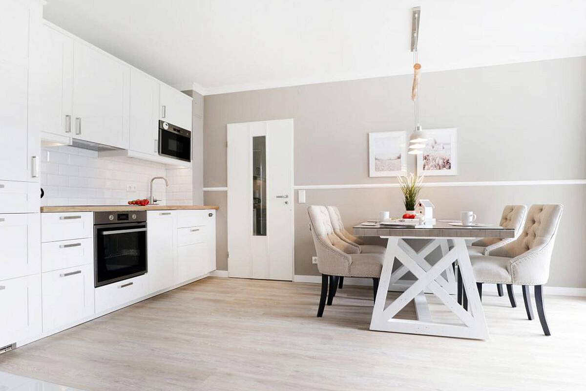 Der helle Wohn- und Essbereich besticht durch einen großzügigen Esstisch und eine gemütliche Sofalandschaft, die bei Bedarf als Schlafplatz für zwei weitere Personen dient. Ein großer Flachbild-TV und kostenfreies WLAN sind selbstverständlich inklusive. Die gesamte Wohnung ist mit einem hochwertigen Vinylboden in Holzoptik ausgelegt.