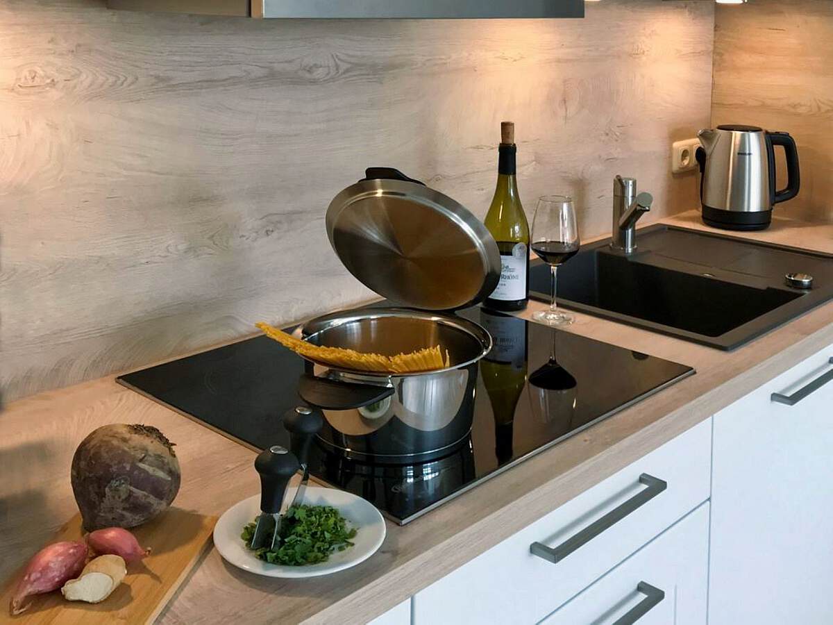 Der einladende Wohn- und Essbereich ist mit einem Flachbild-TV ausgestattet und bietet direkten Zugang zum (saisonal möblierten) Balkon. Die integrierte, voll ausgestattete Küche lässt mit Herd, Backofen, Mikrowelle und Kühlschrank inklusive Gefrierfach keine Wünsche offen.