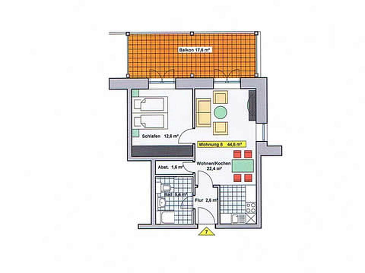 | VaW07 | Meerblick | Wohnfläche 44,6m² Balkon 17,6m² | 2 Zi. | max. 2 Pers. | 1.OG |