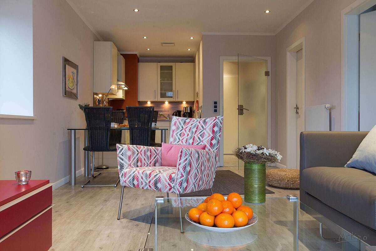 Die modern gestaltete Ferienwohnung 13 in der Villa Wagenknecht in Boltenhagen liegt im 2. Obergeschoss zur Seeseite und besticht mit einer Größe von 45 qm. Hochwertige Möbel prägen das stilvolle Ambiente, und eine komfortable Küchenzeile mit Herd und Geschirrspülmaschine sowie ein Vollbad mit Waschbecken, Badewanne, Dusche und WC bieten allen gewünschten Komfort.